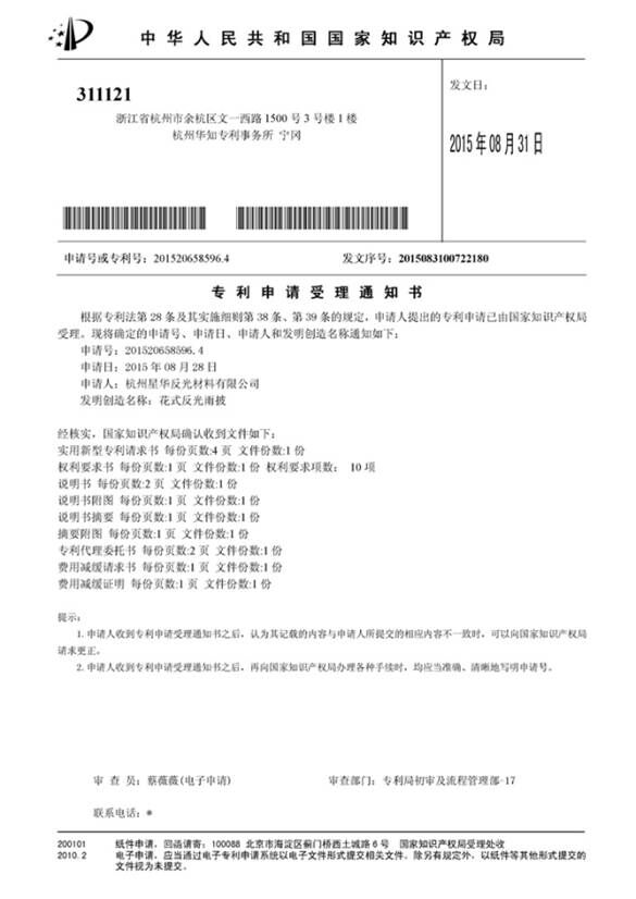 花式反光圖案層的顏色為銀灰色或彩色,花式反光圖案層為銀灰色時(shí),圖案位置反光亮度大于100cd/(lx?m2)。
